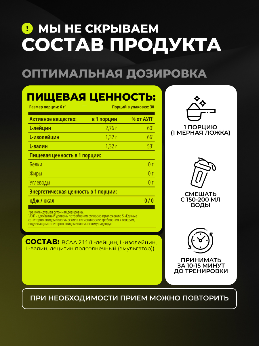Самая востребованная спортивная добавка среди профессиональных спортсменов и новичков. В состав спортивного питания входят незаменимые аминокислоты L-лейцин, L-изолейцин, L-валин в пропорции 2:1:1. Спортивный коктейль без сахара имеет нейтральный вкус.