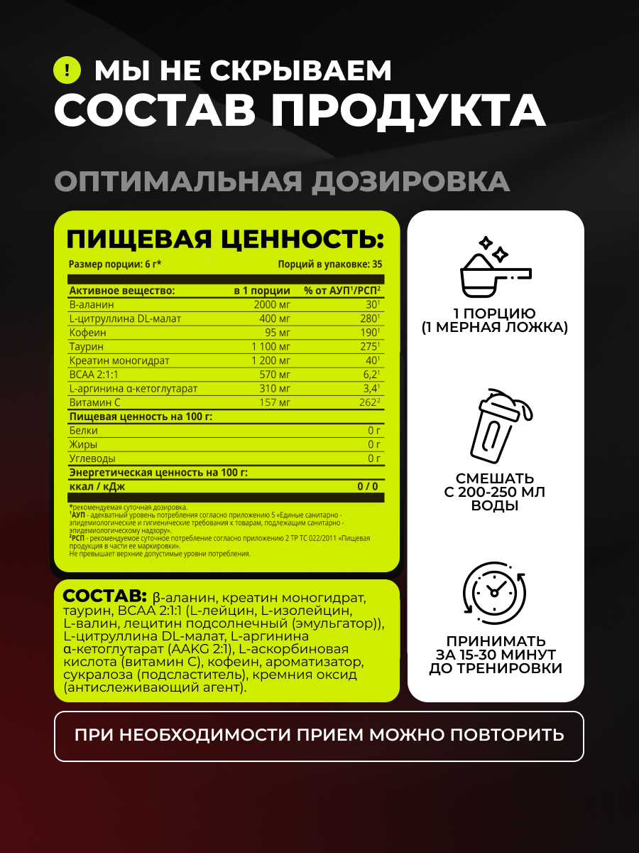 Предтренировочный комплекс содержит аминокислоты L-аргинин и BCAA 2:1:1 и служит дополнительным источником креатина, кофеина, аминокислот таурина, бета-аланина, цитруллина.