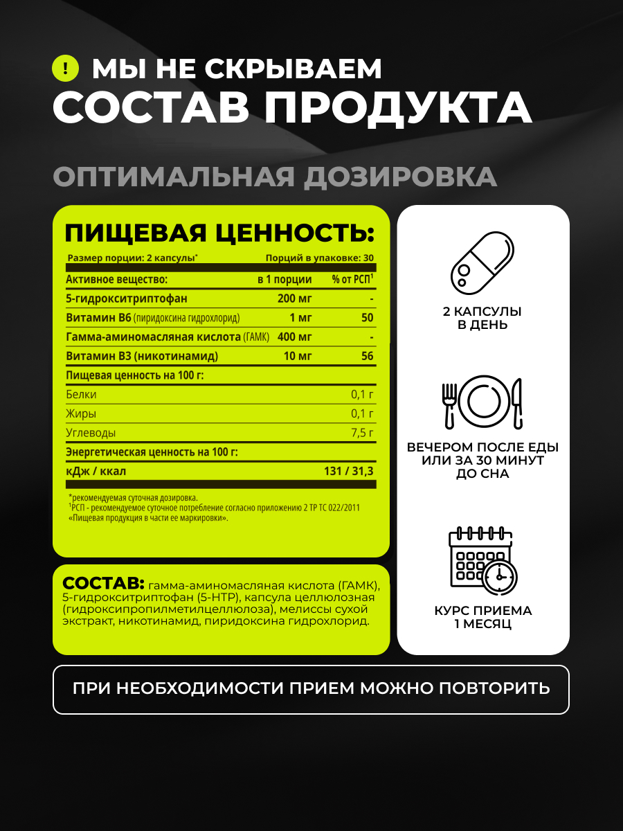 Принимайте по 2 капсулы вечером после ужина или за 30 минут до сна. Рекомендуемый период приема - 1 месяц. Повторите курс при необходимости.