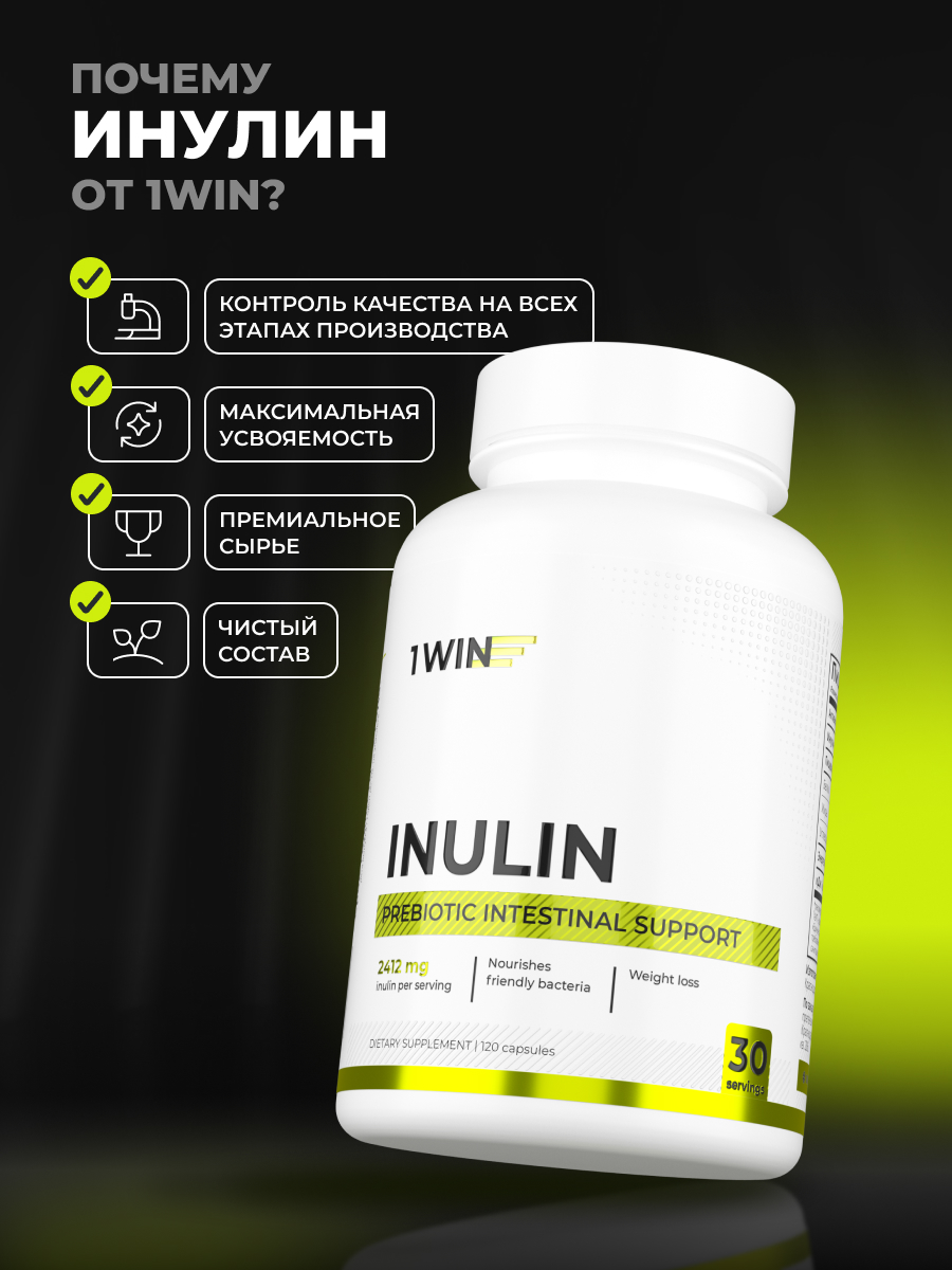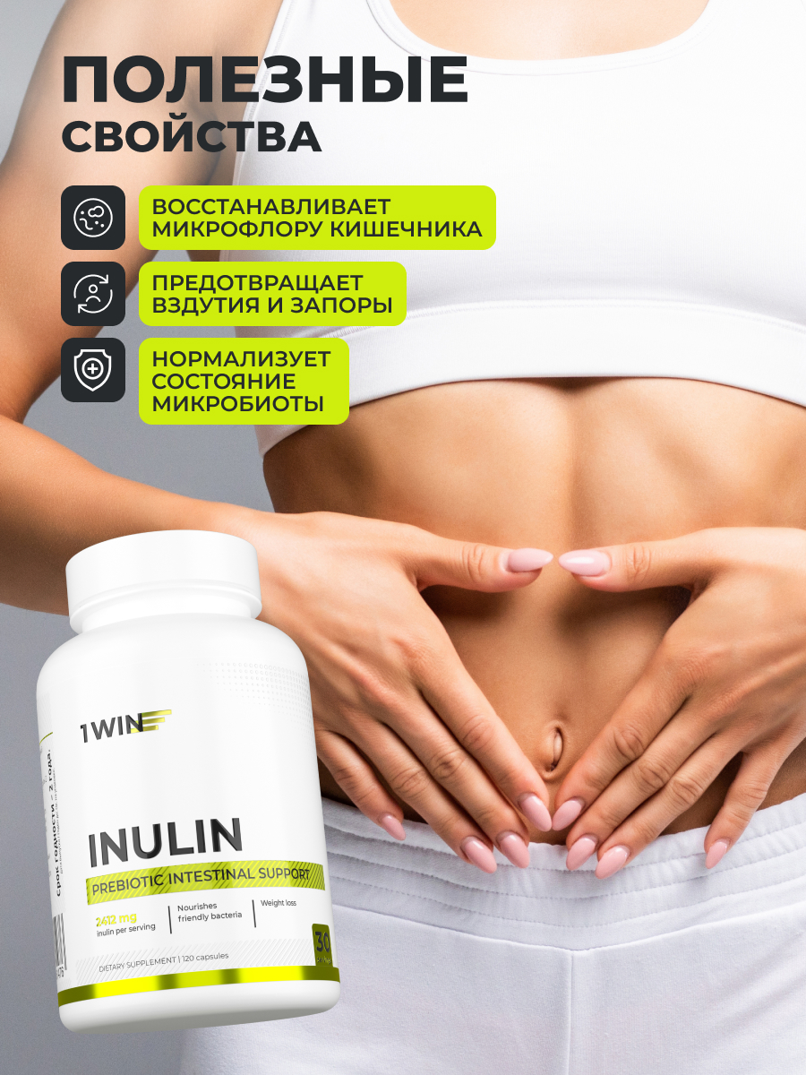 Инулин в капсулах от 1WIN — это натуральный пребиотик, который восстанавливает микрофлору кишечника, нормализует пищеварение и укрепляет иммунитет. Одна порция (4 капсулы) содержит натуральный инулин 2412 мг. Пищевые волокна (клетчатка) являются питательным веществом для полезных бактерий кишечника, способствует их размножению и нормализует состояние микробиоты. Это необходимо для правильной работы пищеварения, предотвращения вздутия и запоров, для снижения сахара в крови и укрепления иммунитета. Продукт полезен для похудения и снижения аппетита. Инулин улучшает метаболизм и продлевает чувство сытости, что позволяет контролировать аппетит и сокращать потребление калорий.Регулярный прием БАД снижает уровень холестерина и триглицеридов, что способствует улучшению здоровья сердечно-сосудистой системы. Одна упаковка (120 капсул) содержит 30 порций. Рекомендуется принимать по 2 капсулы 2 раза в день во время еды. Рекомендовано соблюдение питьевого режима. Продолжительность приема — 1 месяц. При необходимости можно повторить. Подходит для мужчин и женщин.Продукт сертифицирован и имеет свидетельство о государственной регистрации.