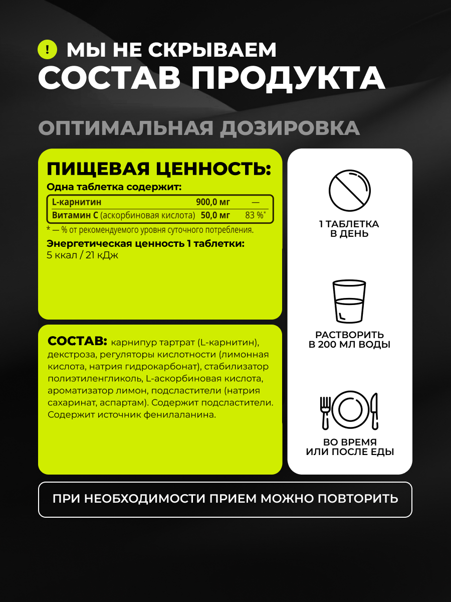 Продукт сертифицирован по стандартам GMP, ISO. В упаковке 17 шипучих таблеток. Рекомендуется принимать по одной таблетке в день во время или после еды. Перед употреблением таблетку необходимо растворить в стакане питьевой воды (200 граммов). Применять карнитин следует непосредственно перед тренировкой или во время неё.