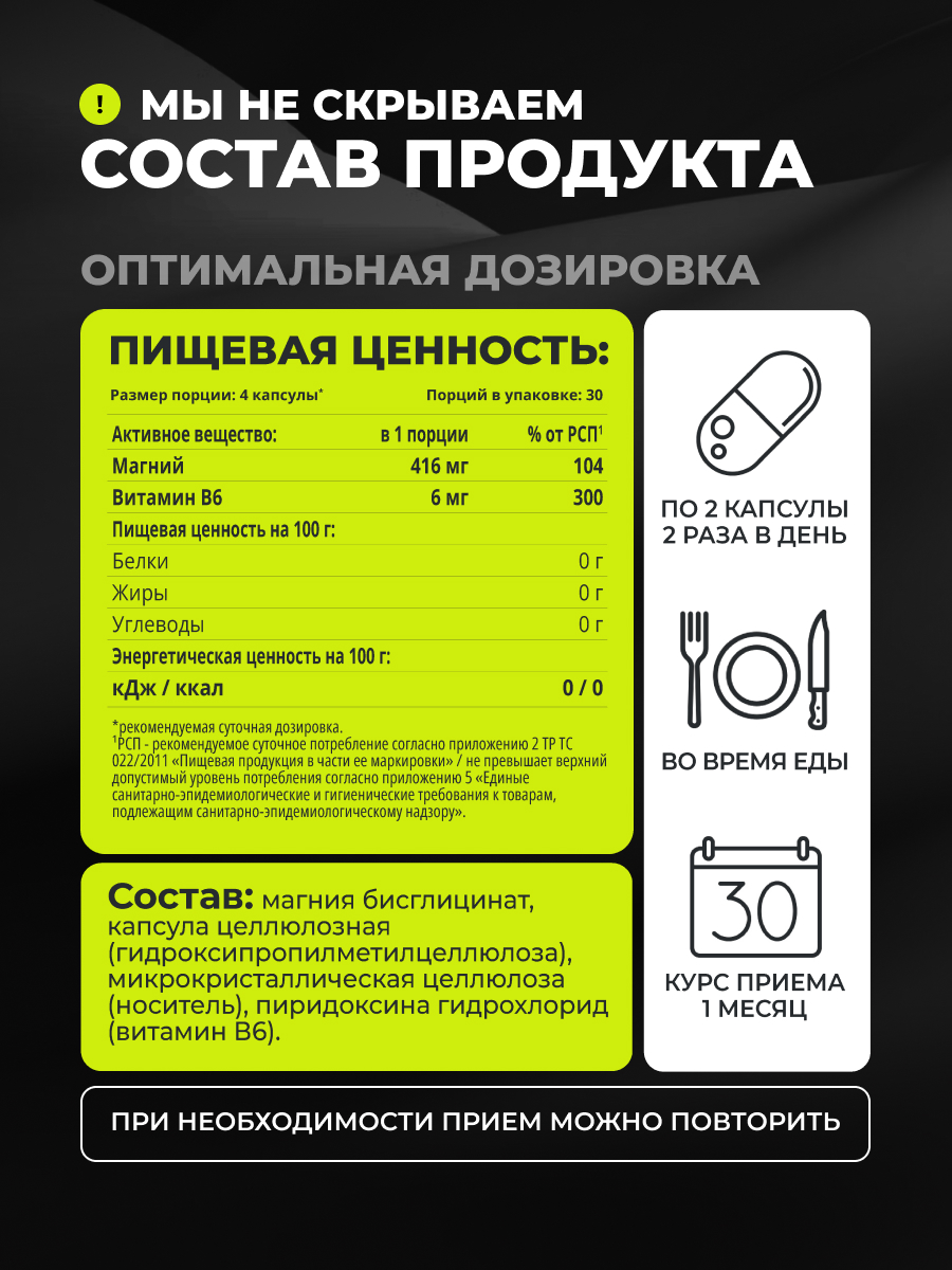 Прием добавки помогает противостоять стрессу, выравнивает эмоциональный фон, снижает последствия перенапряжения. Бисглицинат магния + B6 избавляет от бессонницы, позволяя быстрее засыпать и чувствовать себя на утро отдохнувшим. Восполнение дефицита магния важно для здоровья сердца и сердечно-сосудистой системы, т.к. его нехватка отражается на артериальном давлении и нарушении сердечного ритма.