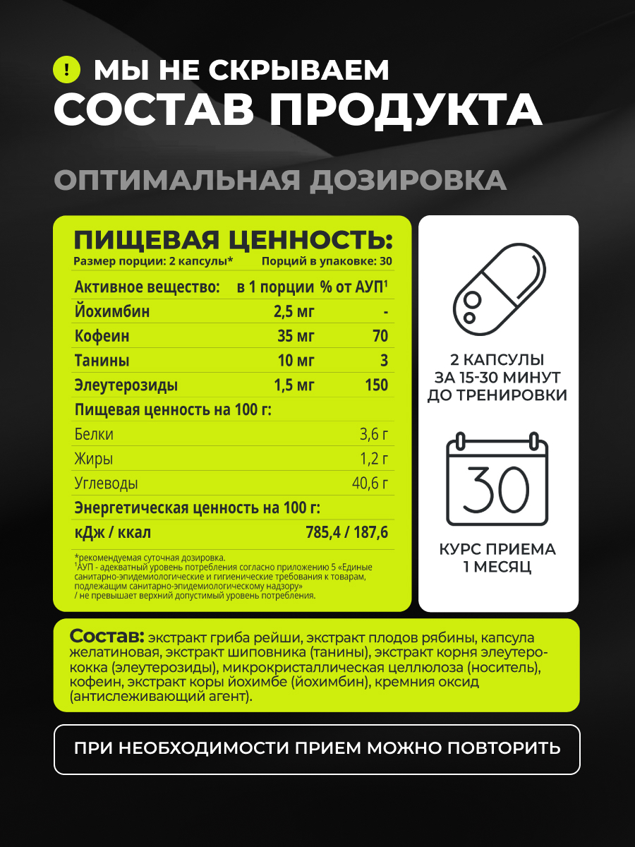 Экстракт коры йохимбе (йохимбин) ускоряет метаболизм, повышает работоспособность и выносливость, имеет жиросжигающий эффект. Компонент рекомендован для спортсменов, которые хотят перевести жировую массу в мышечную, а также всем, кто стремится сбросить вес.