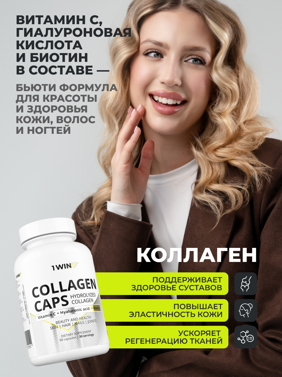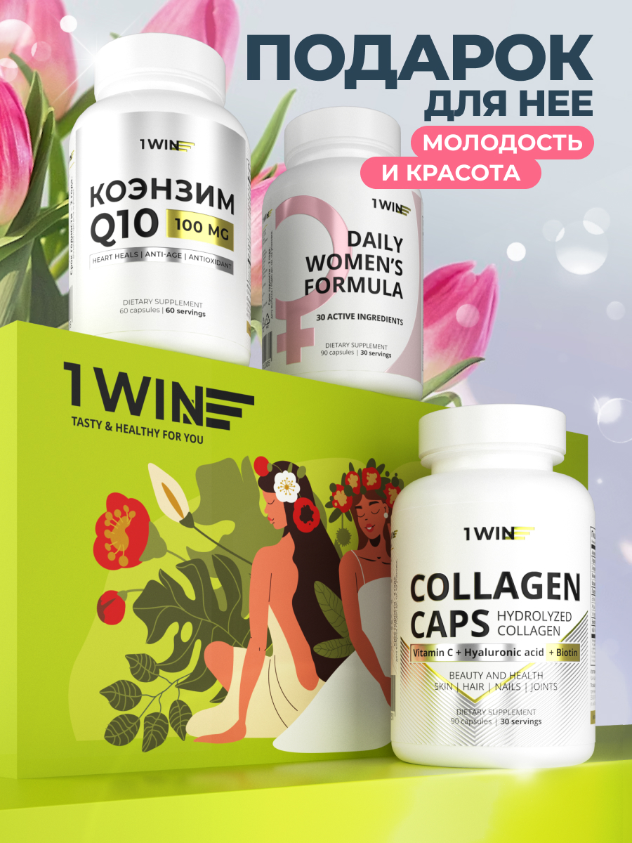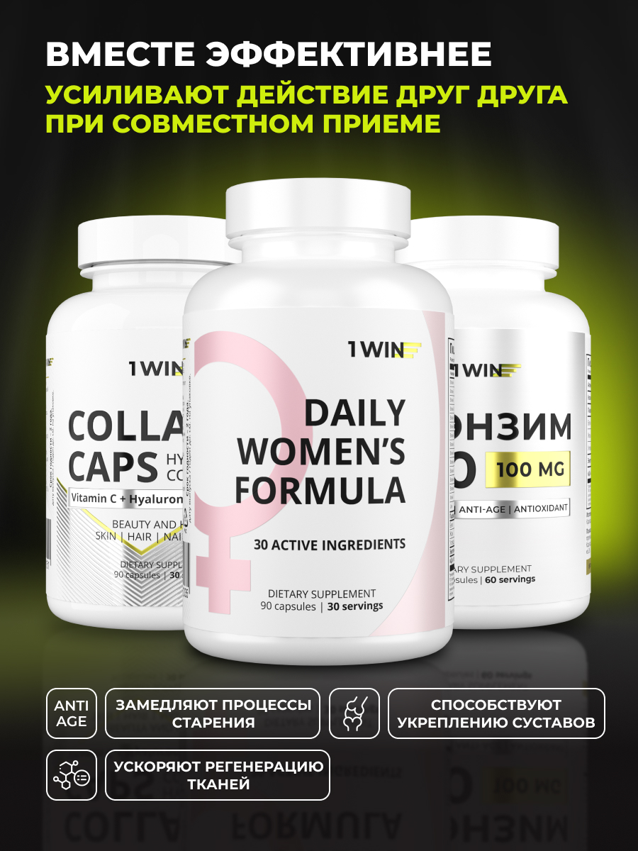 1WIN / Набор витаминов. Мультивитамины для женщин 90 капсул + коэнзим Q10 60 капсул +Коллаген с биотином и гиалуроновой кислотой 90 капсул