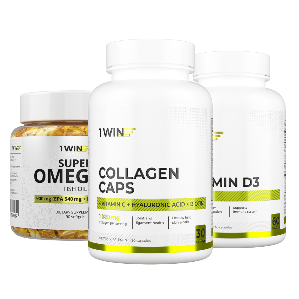 1WIN / Набор витаминов, Омега-3 90 капсул + Коллаген+биотин 90 капсул + подарок D3 600МЕ