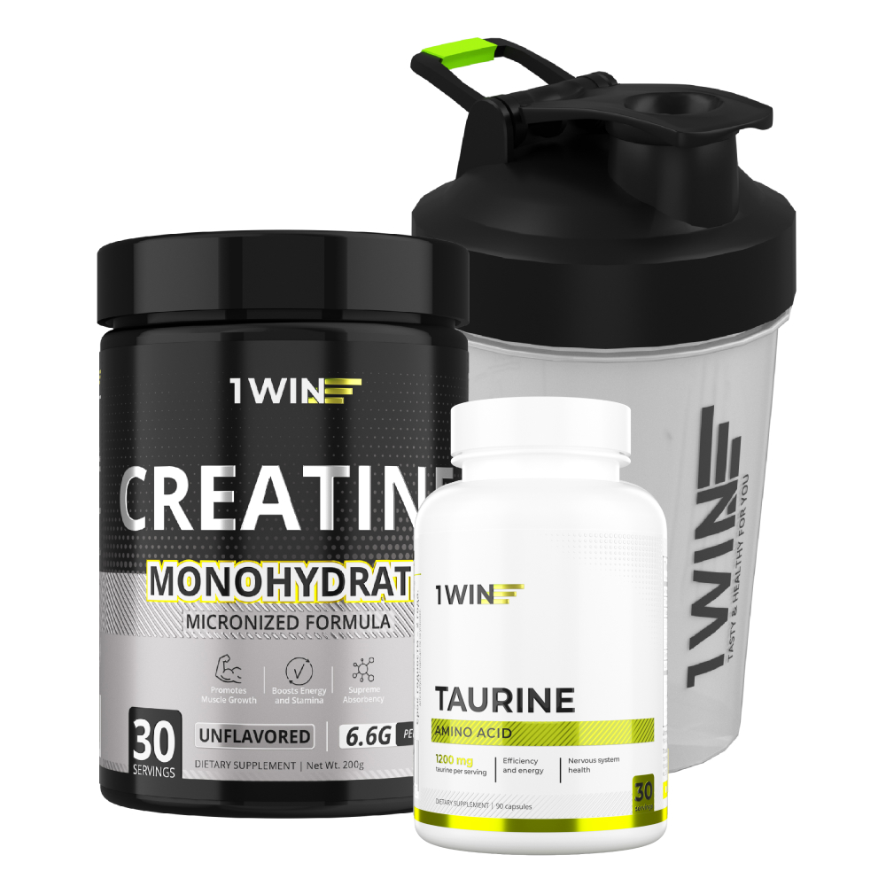 1WIN / Набор для спортсмена. Креатин Нейтральный вкус 200г + Шейкер черный 400 мл + подарок Таурин 90 капсул
