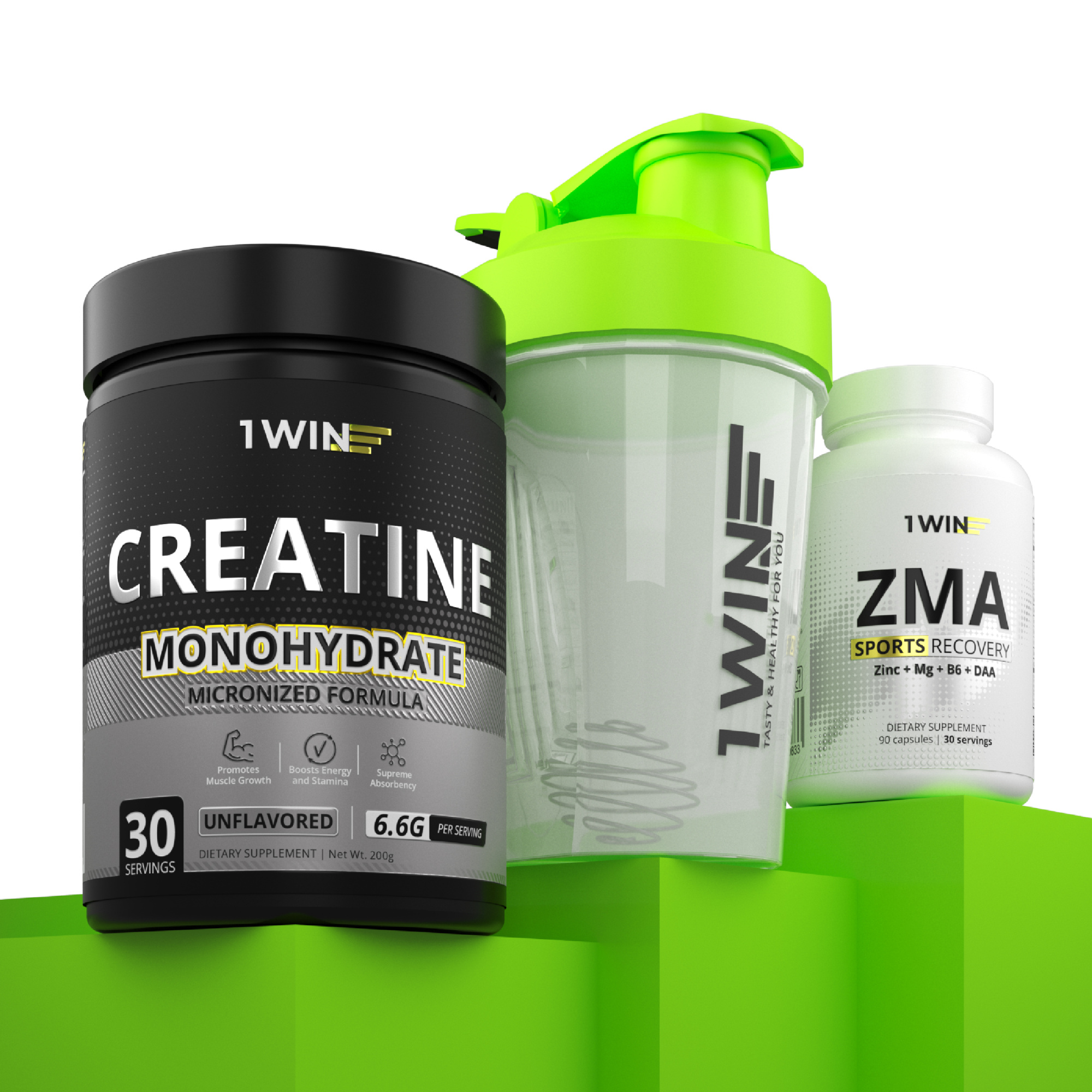 1WIN / Набор для спортсмена. Креатин Нейтральный вкус 200г + Шейкер зелёный 400 мл + подарок ZMA 90 капсул