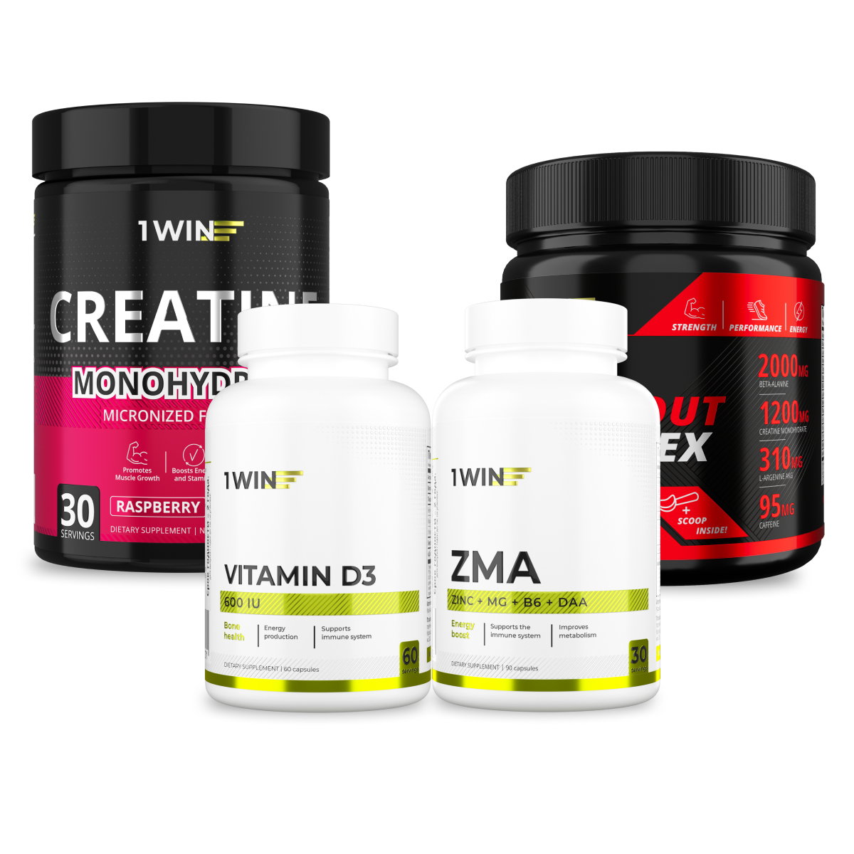 1WIN / Набор витаминов: Креатин вкус Малина 200гр + Предтрен вкус Кола-Лимон 35 порций + ZМА 90 капсул + подарок Витамин D3 2000МЕ 60 капсул