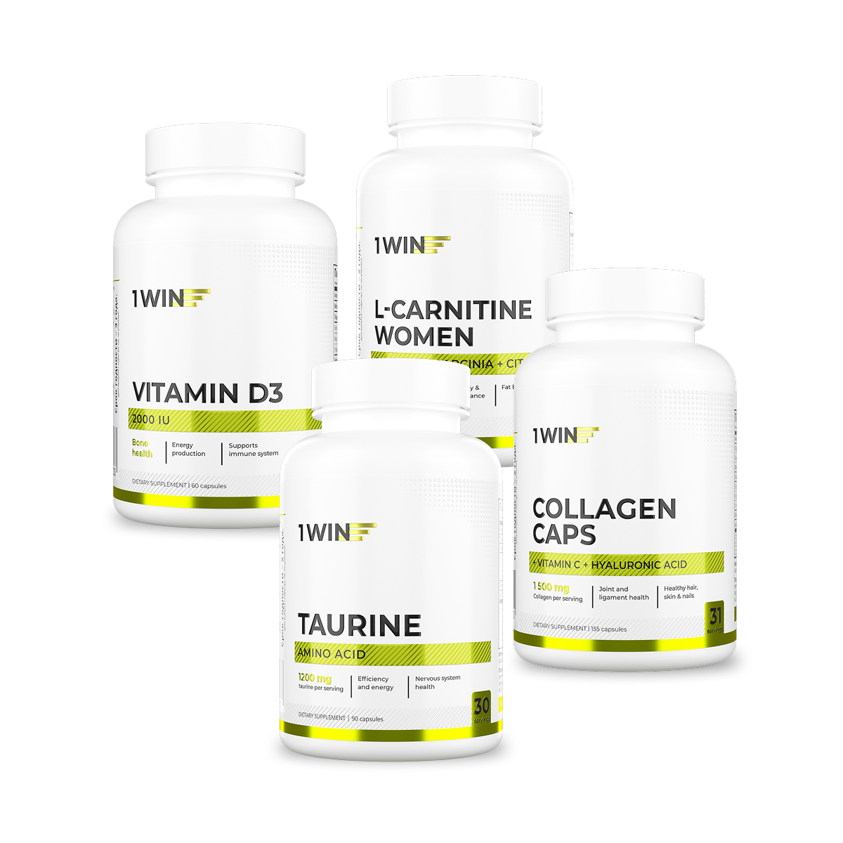 1WIN / Набор витаминов. Коллаген с гиалуронкой и витамином С 155 капсул + Таурин 90 капсул + L-карнитин WOMEN 90 капсул +подарок Витамин D3 2000МЕ
